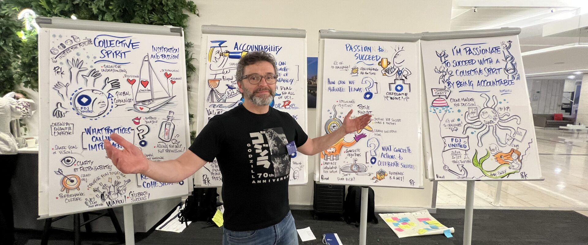Philippe-Elie Kassabi dessine en temps réel lors de vos conférences, séminaires et ateliers. Formé aux Beaux-Arts, ancien manager PME, il a développé une pratique unique qui place le dessin au cœur des organisations.